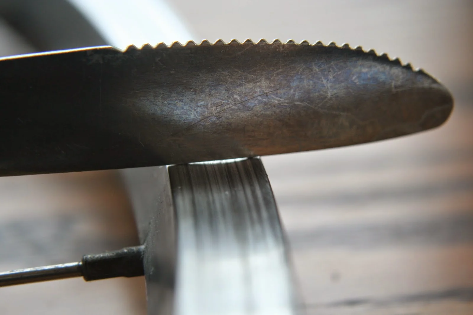 See how the knife touches the top and bottom but not the center? That's because the brake pads have dug out a valley. Brake pads act like sand paper, especially when they get old or imbedded with actual sand and road debris; give them time and they'll carve the aluminum right out of the rim.